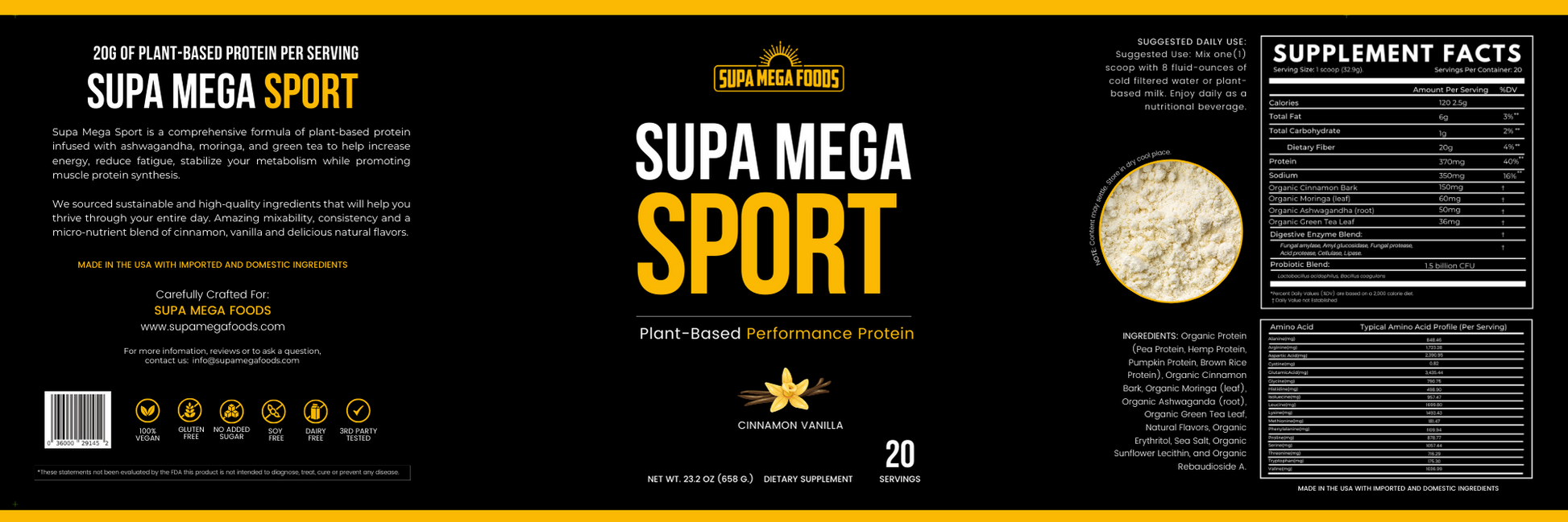 Supa Mega Sport is a comprehensive formula of plant-based protein infused with ashwagandha, moringa, and green tea to help increase energy, reduce fatigue, stabilize your metabolism while promoting muscle protein synthesis.